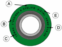 A - materiál spirálové pásky a výplně B - jmenovitá velikost příruby a tlaková třída C - výrobce D - norma E - materiál vnitřního kroužku (3 = vnitřní kroužek)